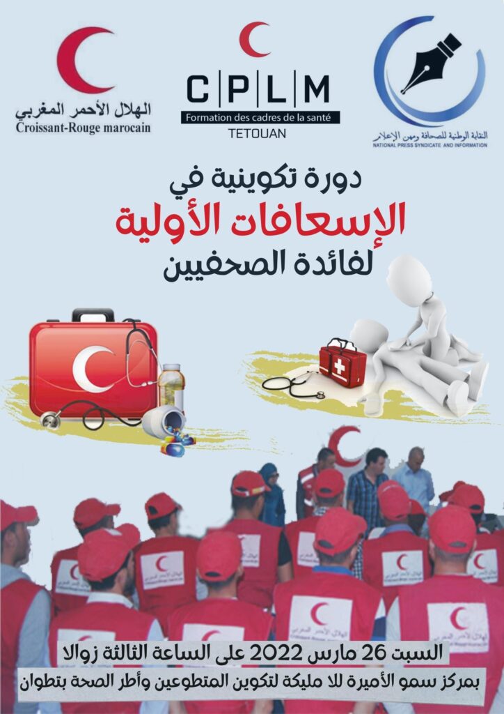 تنظم النقابة الوطنية للصحافة ومهن الإعلام، دورة تكوينية في الإسعافات الأولية لفائدة الصحفيين والصحفيات، بمركز سمو الأميرة للا مليكة لتكوين المتطوعين وأطر الصحة بتطوان، يوم السبت 26 مارس 2022 على الساعة الثالثة زوالا.
