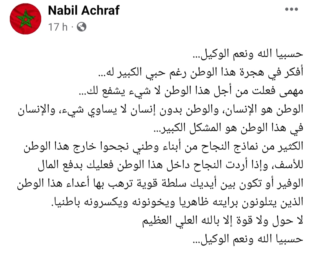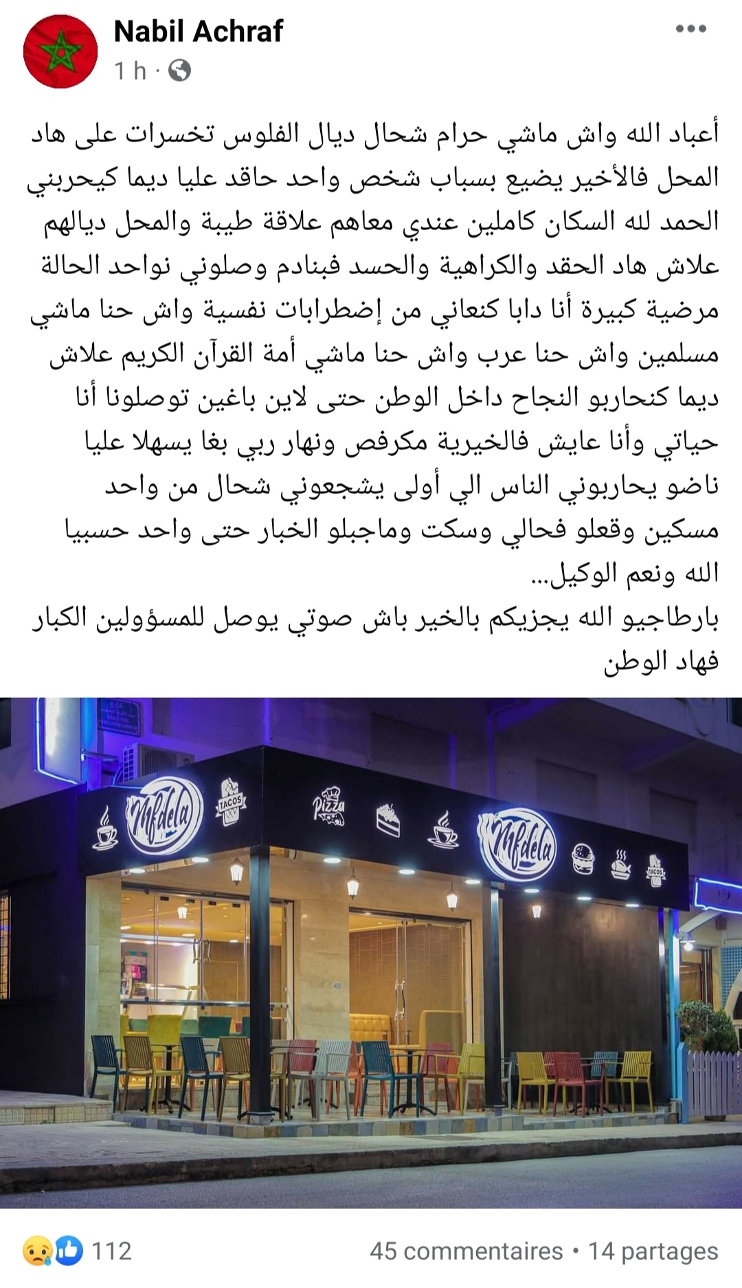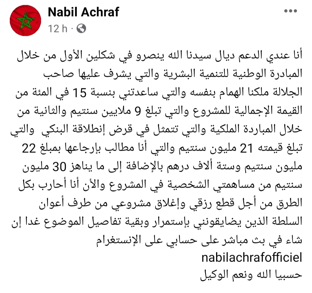 ومما جاي في تدوينات الفنان التطواني ” سأراسل السيد عامل تطوان وأتمنى أن ينصفني “، وتابع أشرف في تدوينة أخرى ” أنا عندي الدعم ديال سيدنا الله ينصرو في شكلين الأول من خلال المبادرة الوطنية للتنمية البشرية والتي يشرف عليها صاحب الجلالة ملكنا الهمام بنفسه والتي ساعدتني بنسبة 15 في المئة من القيمة الإجمالية للمشروع والتي تبلغ 9 ملايين سنتيم والثانية من خلال المباردة الملكية والتي تتمثل في قرض إنطلاقة البنكي والتي تبلغ قيمته 21 مليون سنتيم والتي أنا مطالب بإرجاعها بمبلغ 22 مليون سنتيم وستة ألاف درهم بالإضافة إلى ما يناهز 30 مليون سنتيم من مساهمتي الشخصية في المشروع والأن أنا أحارب بكل الطرق من أجل قطع رزقي وإغلاق مشروعي من طرف أعوان السلطة الذين يضايقونني بإستمرار وبقية تفاصيل الموضوع غدا إن شاء في بث مباشر على حسابي على الإنستغرام، حسبيا الله ونعم الوكيل”.