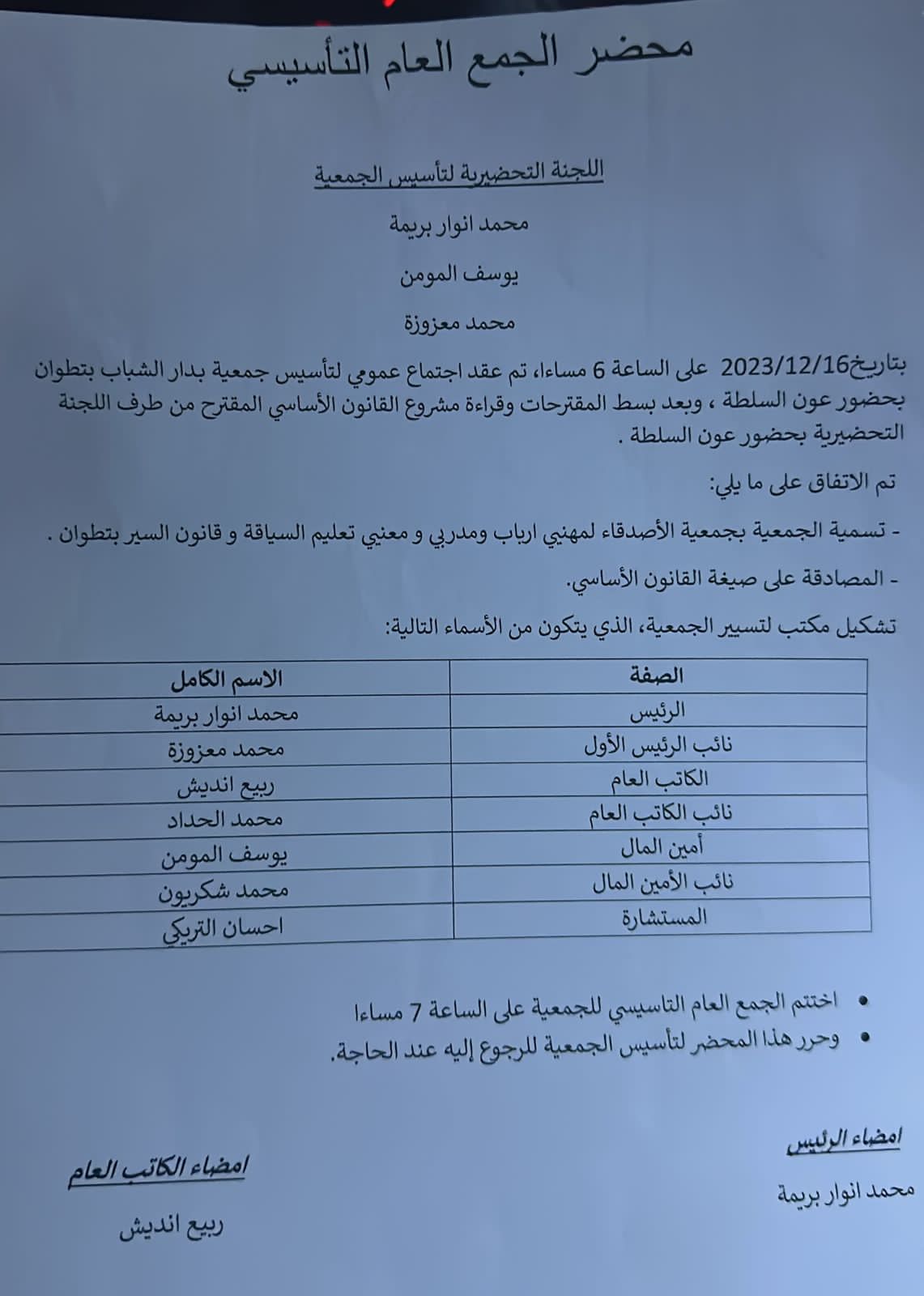 عقدت جمعية الأصدقاء لمهنيي أرباب ومدربي تعليم السياقة وقانون السير بتطوان، جمعها التأسيسي يوم 16 دجنبر الجاري بدار الشباب بتطوان، حيث تم تشكيل مكتب الجمعية الذي أعطى السيد محمد انوار بريمة رئاسة الجمعية، والتي جاءت تشكيلة مكتبه على الشكل التالي :