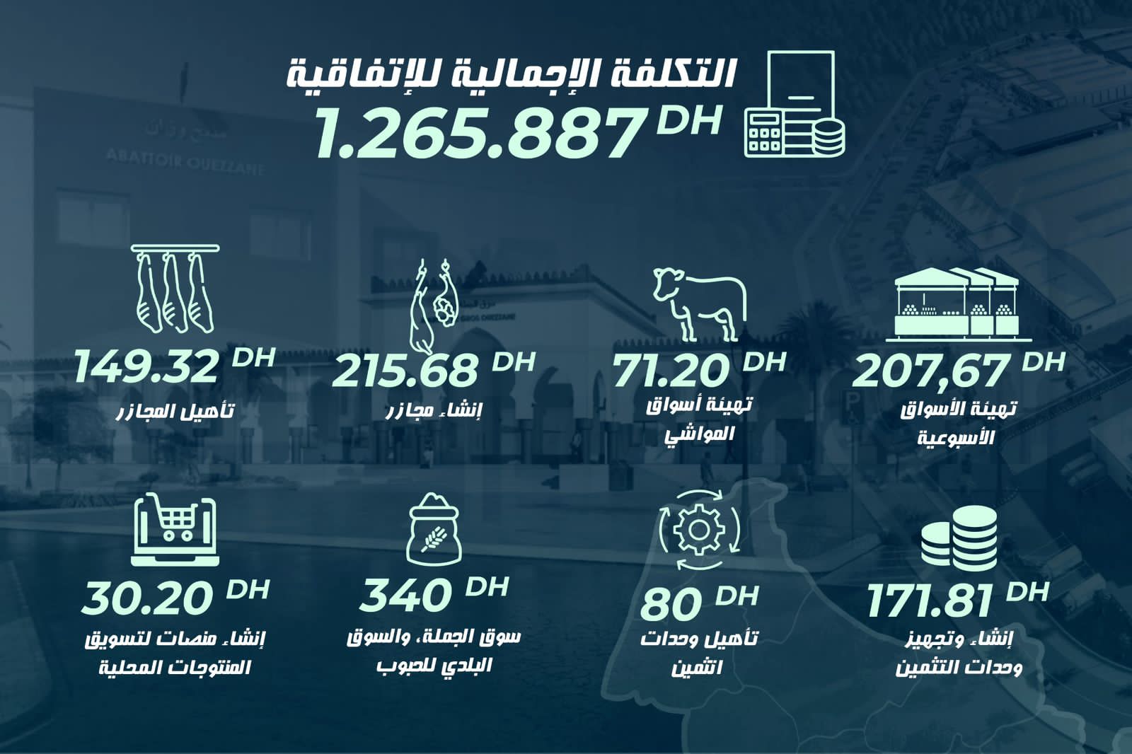 خصص لإنجاز الاتفاقية الخاصة ميزانية مهمة تقدر ب 887 265 1 ألف درهم، تم توزيعها على مختلف المشاريع الإستراتيجية، وتهم هذه المشاريع تهيئة الأسواق الأسبوعية، وتهيئة أسواق المواشي، وإنشاء وتأهيل المجازر، إضافةً إلى إنشاء وتجهيز وحدات التثمين وتأهيلها، فضلاً عن مشاريع مرتبطة بأسواق الجملة، والسوق البلدي للحبوب، وكذا إنشاء منصات لتسويق المنتجات المحلية.