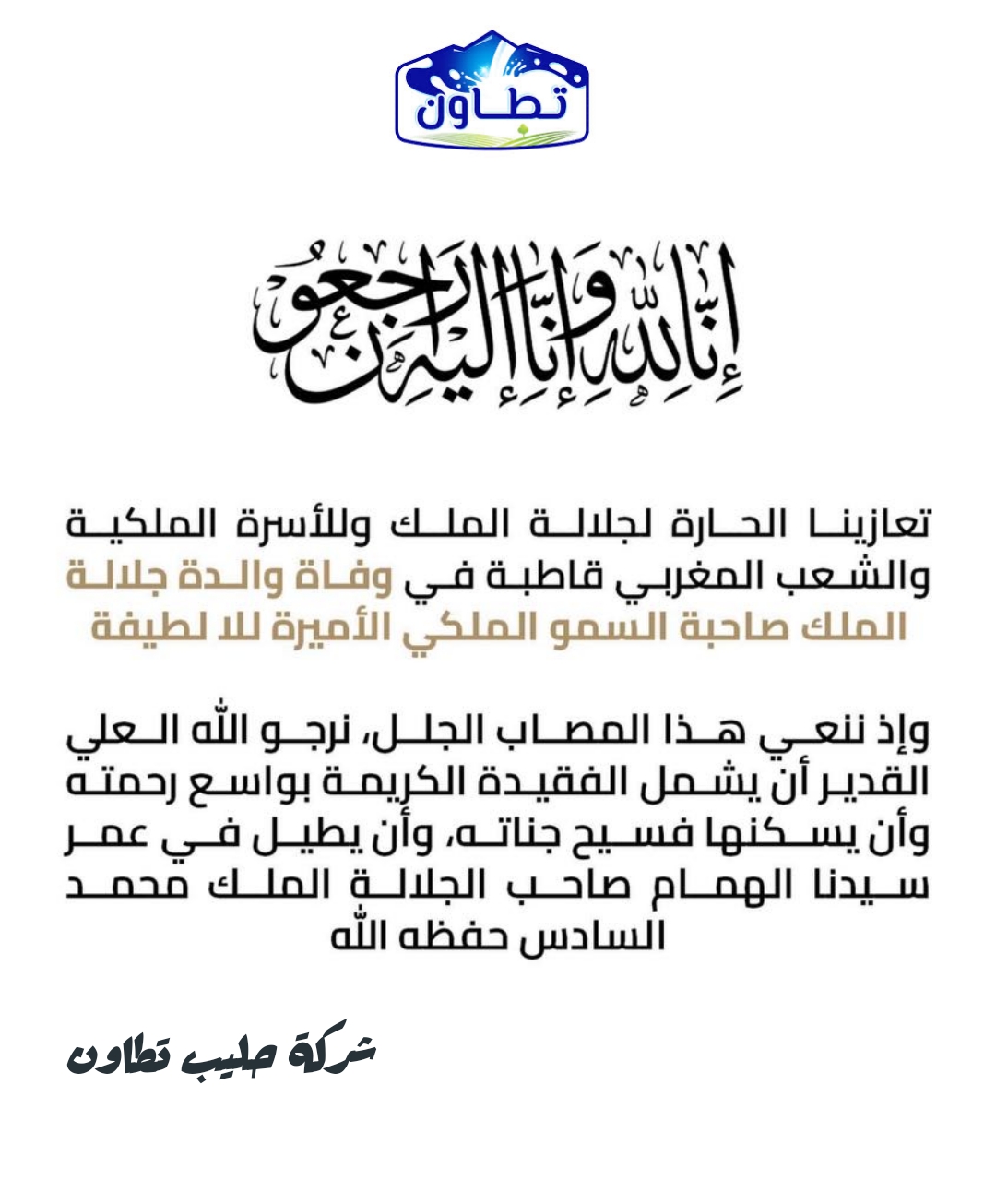 ببالغ الحزن والأسى تلقينا نبأ وفاة الأميرة لطيفة أمحزون والدة جلالة الملك محمد السادس نصره الله وأيده، وبهذه المناسبة الأليمة يتقدم السيد محمد رضوان الغازي أصالة عن نفسه ونيابة عن باقي مسيري وعمال شركة حليب تطاون بخالص العزاء والمواساة إلى جلالة الملك محمد السادس، وإلى أصحاب وصاحبات السمو الملكي الأمراء الأجلاء والأميرات الجليلات، وكافة أفراد الأسرة الملكية الشريفة، سائلين المولى عز وجل أن يتغمد الفقيدة بواسع رحمته ورضوانه، وأن يدخلها فسيح جناته بإذنه تعالى، وأن يلهم أهلها وذويها جميل الصبر والسلوان.