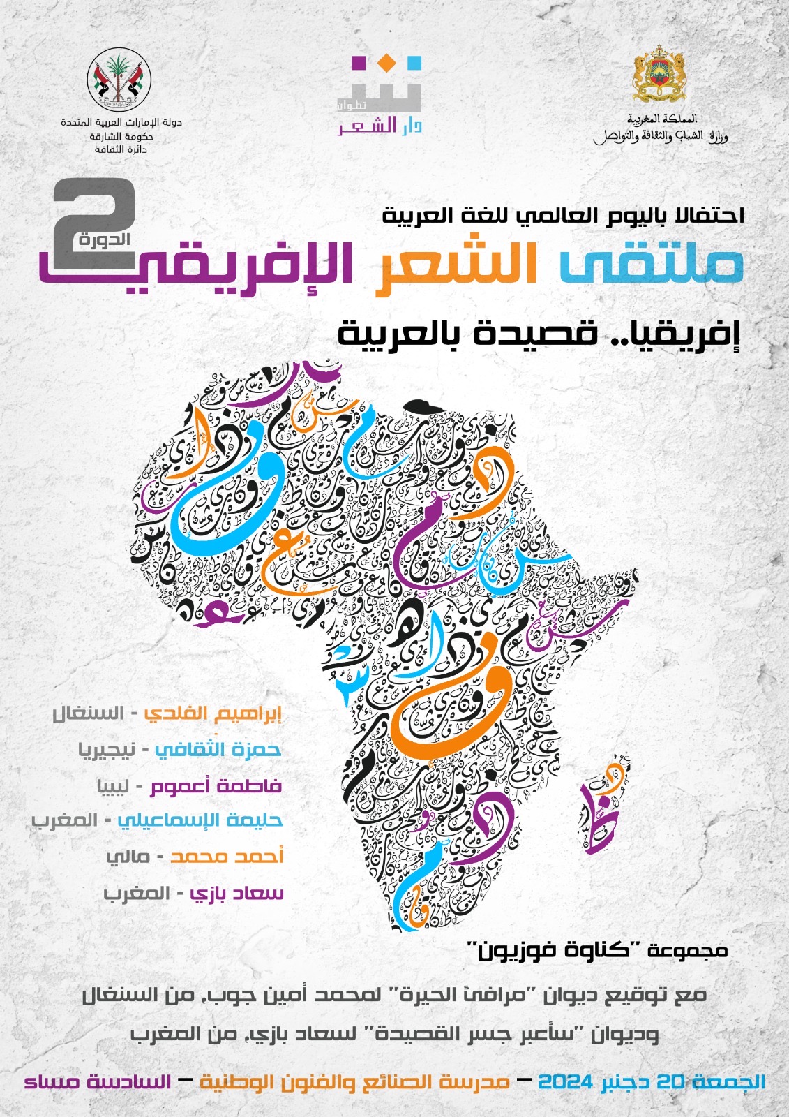 وتنعقد هذه الدورة تحت شعار “إفريقيا.. قصيدة بالعربية”، بمشاركة الشاعر إبراهيم الفلدي من السنغال والشاعر حمزة الثقافي من نيجيريا والشاعرة فاطمة أعموم من ليبيا والشاعرة حليمة الإسماعيلي من المغرب والشاعر أحمد محمد من مالي والشاعرة سعاد بازي من المغرب. كما يشهد الملتقى تقديم وتوقيع ديوان “مرافئ الحيرة” للشاعر السنغالي محمد أمين جوب، وديوان “سأعبر جسر القصيدة” للشاعرة المغربية سعاد بازي.