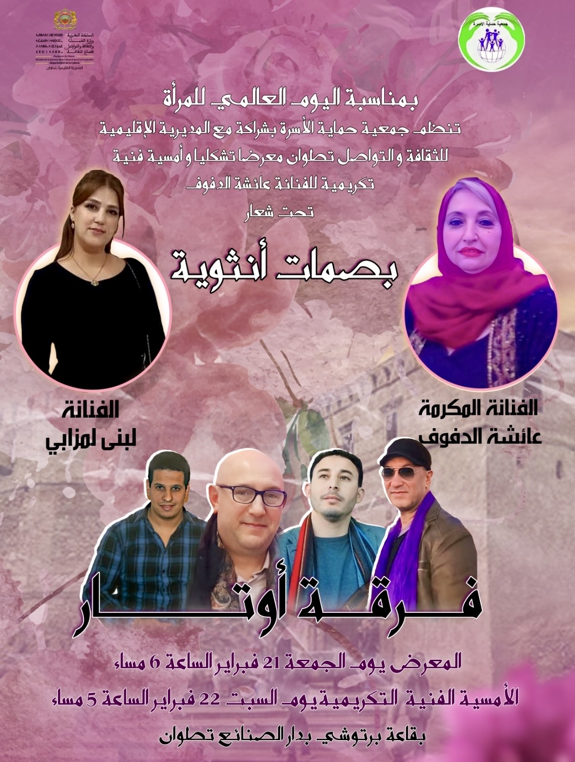 شهدت قاعة برتوشي بدار الصنائع والفنون بتطوان يومي 21 -22 فبراير الجاري، عرسا فنيا بمناسبة ذكرى ميلاد صاحبة السمو الملكي الأميرة لالة خديجة الذي يخلد كل سنة، واحتفالا بعيد المرأة الذي يصادف 8 من مارس، حيث تشرفت جمعية حماية الأسرة يومه 21 بشراكة وتعاون مع المديرية الإقليمية للثقافة بتطوان تحت شعار: “بصمات أنثوية” من افتتاح المعرض التشكيلي لكل من أيقونة الفن التشكيلي السيدة “عائشة الدفوف” التي تتحدث لوحاتها عن قضايا المرأة في زمننا الراهن والفنانة المبدعة “لبنى لمزابي” التي تهدف من خلال لوحاتها إلى التعريف بالتراث المغربي المادي واللامادي ومآثر مدينة تطوان، فالبصمات الأنثوية دائماً ما تبهر محب الفن التشكيلي بمواضيعه المختلفة.