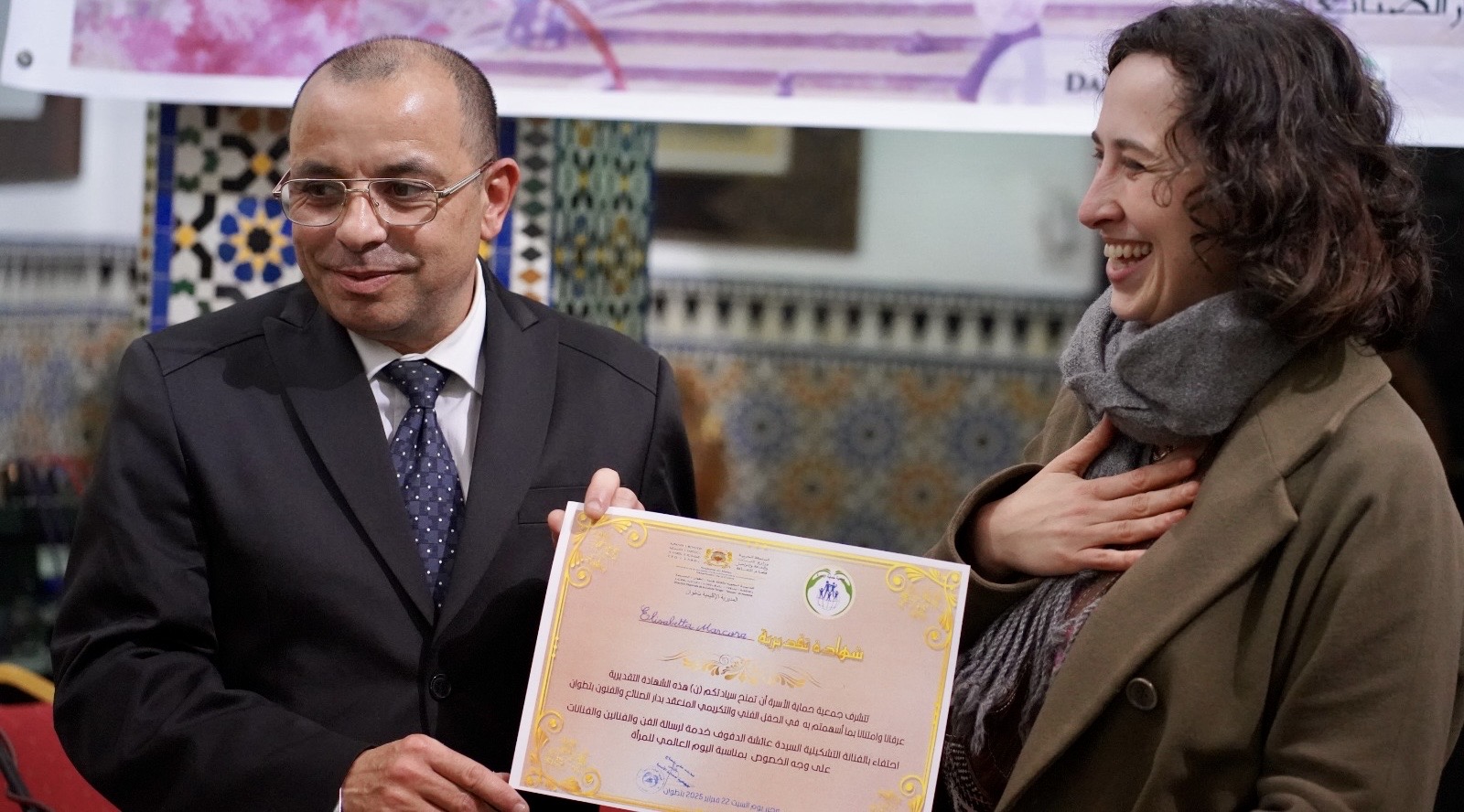 حضر الافتتاح كل من المدير الإقليمي لوزارة الشباب والثقافة والتواصل ـ فرع الثقافة ـ بتطوان السيد محمد العربي المصباحي الذي ألقى كلمة نوه فيه بجهود الفنانتين التشكيليتين عائشة الدفوف ولبنى لمزابي، ثم تلاها كلمة للفنانة التشكيلية عائشة الدفوف ورئيس جمعية حماية الأسرة والفنانة لبنى لمزابي.
