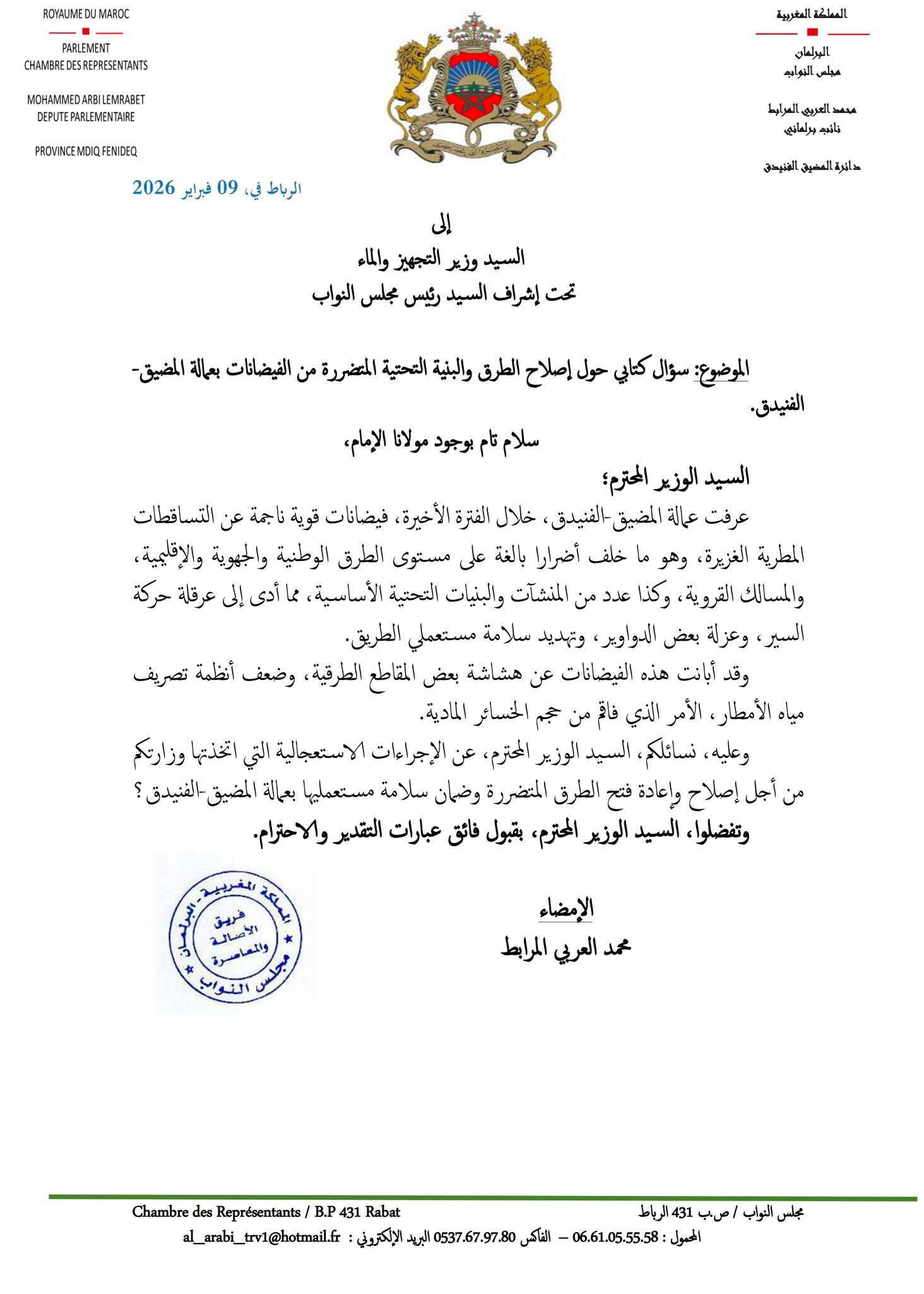 دقّ النائب البرلماني محمد العربي المرابط، عن فريق حزب الأصالة والمعاصرة بمجلس النواب، ناقوس الخطر بشأن الوضع الذي خلفته الفيضانات الأخيرة التي ضربت عمالة المضيق-الفنيدق، وذلك عبر توجيه سؤال كتابي إلى رئيس الحكومة حول الإجراءات الحكومية المبرمجة لإصلاح الأضرار وإعادة تأهيل البنيات المتضررة.